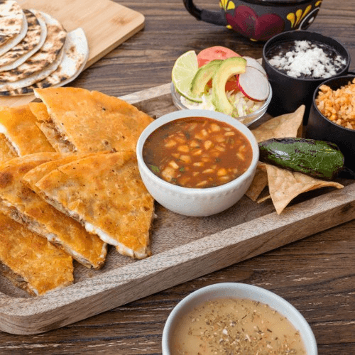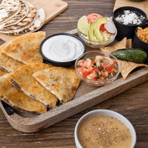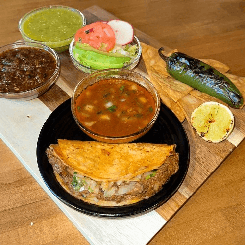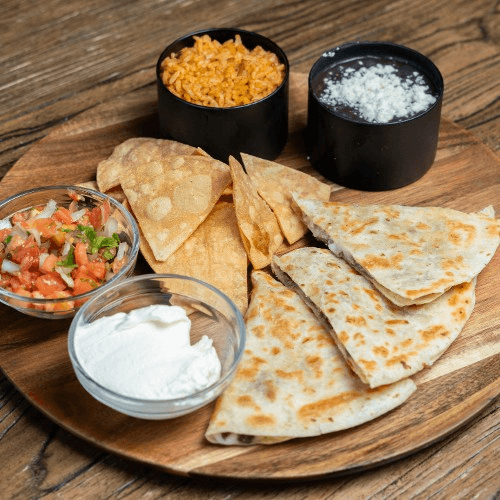 Half portion with your choice of plain cheese or chicken, birria, steak or veggies with sides of rice and/or beans and sour cream.