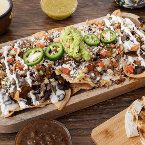 Choice of meat topped with beans, cheese, pico de gallo, jalepenos, and sour cream.