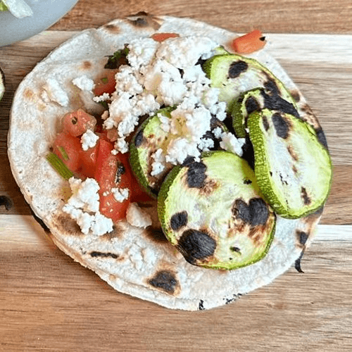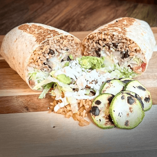 Calabacitas (fresh squash grilled) or rajas ranchero (creamy vegetable strips), rice, veggie beans, cheese, lettuce, tomato, and sour cream rolled in a flour tortilla.