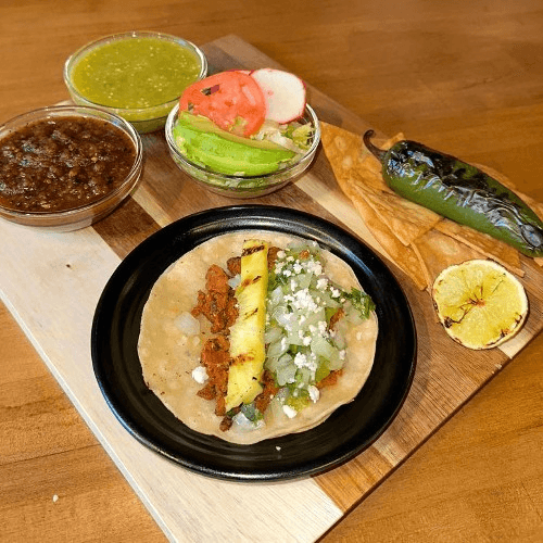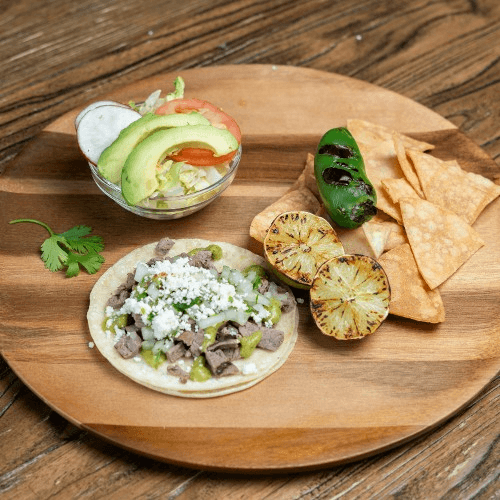 Choose calabacitas or rajas rancheras. Two tacos with corn or flour tortillas. Topped with cilantro, onions, and traditional sauce. Served with rice, beans, cheese, salad and avocado.