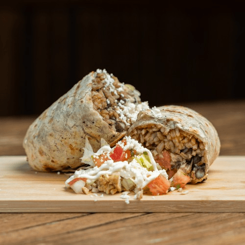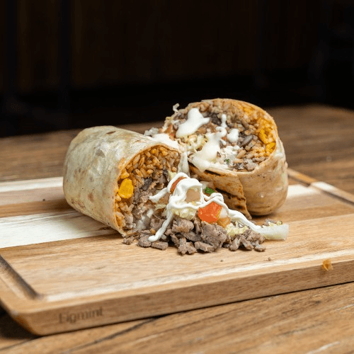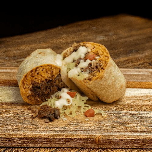 Seasoned ground beef, rice, beans, cheese, lettuce, tomato, and sour cream rolled in a flour tortilla