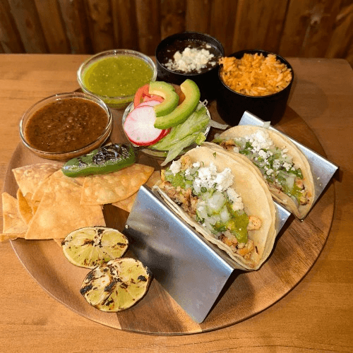 Our signature tacos featuring a mouthwatering combo of either Steak and Chorizo or Chicken and Chorizo, super popular in our home of Saltillo MX. Topped with melted cheese, grilled onions and jalapenos, taco sauce, queso fresco, and pico de gallo. Served with your choice of Canned Soda plus two delicious churros!