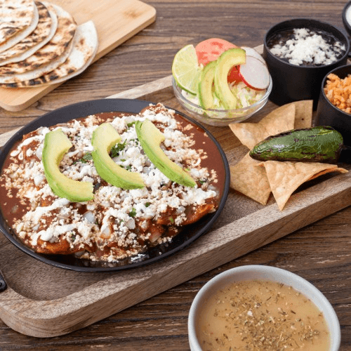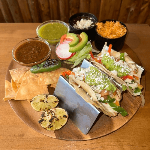 Choice of main ingredient and cheese wrapped in corn tortillas. Topped with cheese, onions, and cilantro. Served with lettuce, avocado, sour cream and sides of rice, beans and cheese.