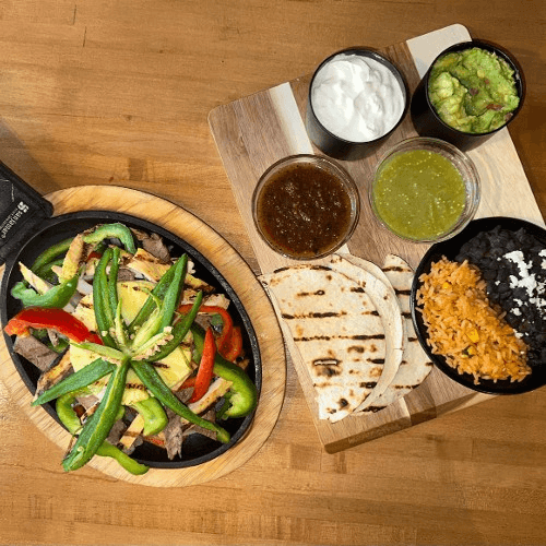 Marinated chicken or steak topped with grilled peppers and onions. Served with pico de gallo, rice, beans and cheese, sour cream and tortillas.