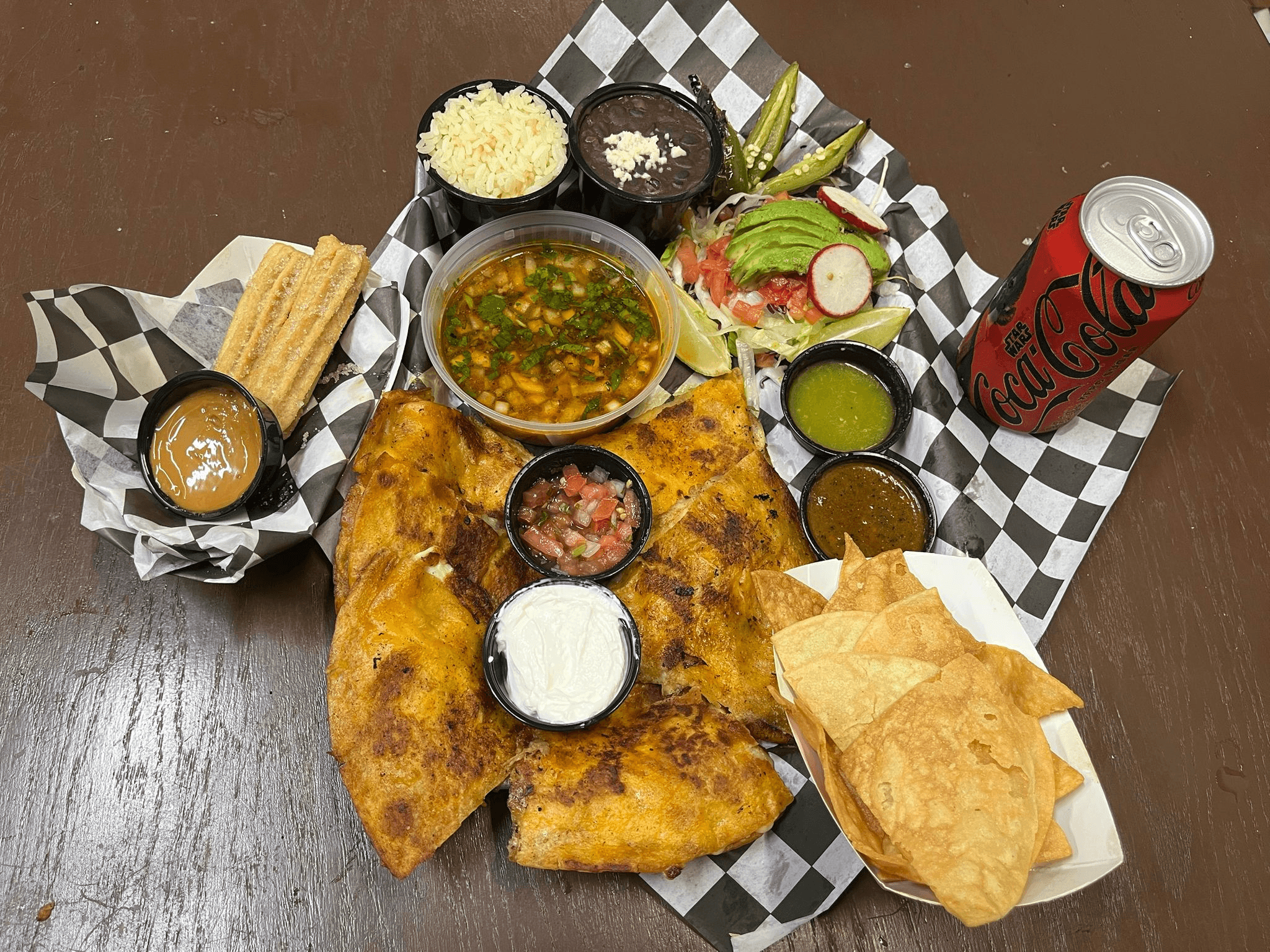 Slow roasted beef birria with melted cheese between two 10" flour tortillas. Served with sour cream, pico de gallo, rice, and/or beans. Plus enjoy your choice of Canned Soda plus two delicious churros!
