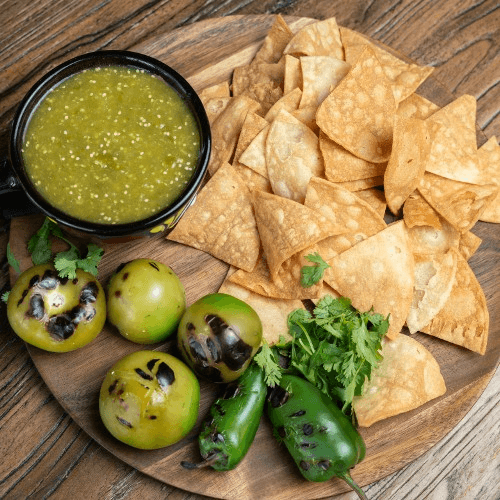 Please choose from our freshly made fire-roasted salsas with hand-cut tortilla chips! Verde: A green tomatillo salsa with garlic, onion, and jalapenos. Rojo: A bold red salsa with garlic, onion, serrano peppers, and chile de arbol. Volcano: Our spiciest red salsa with garlic, onion, habanero peppers, and chile de arbol.