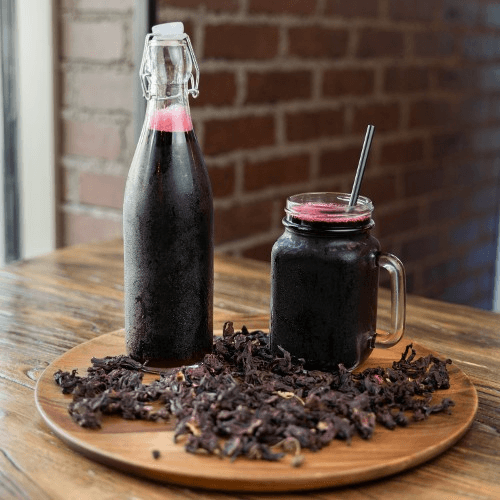 A vibrant hibiscus tea, brewed from dried hibiscus flowers and lightly sweetened. Served chilled for a crisp, tangy, and refreshing sip.