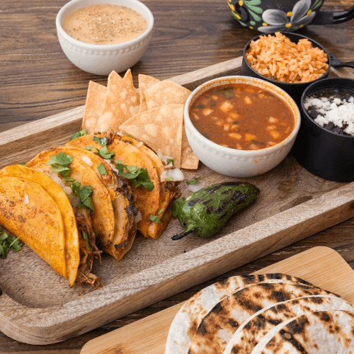 Served on a flour tortilla or in a crunchy shell with choice of chicken, birria, steak or veggies. Served with sides of lettuce, cheese, pico, sour cream, rice and/or beans