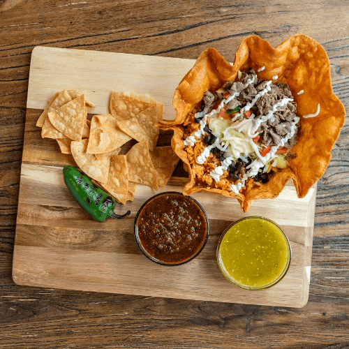 Chicken or steak topped with grilled peppers & onions, lettuce, tomato, crispy nacho pieces & dressing. Served in a tortilla bowl.