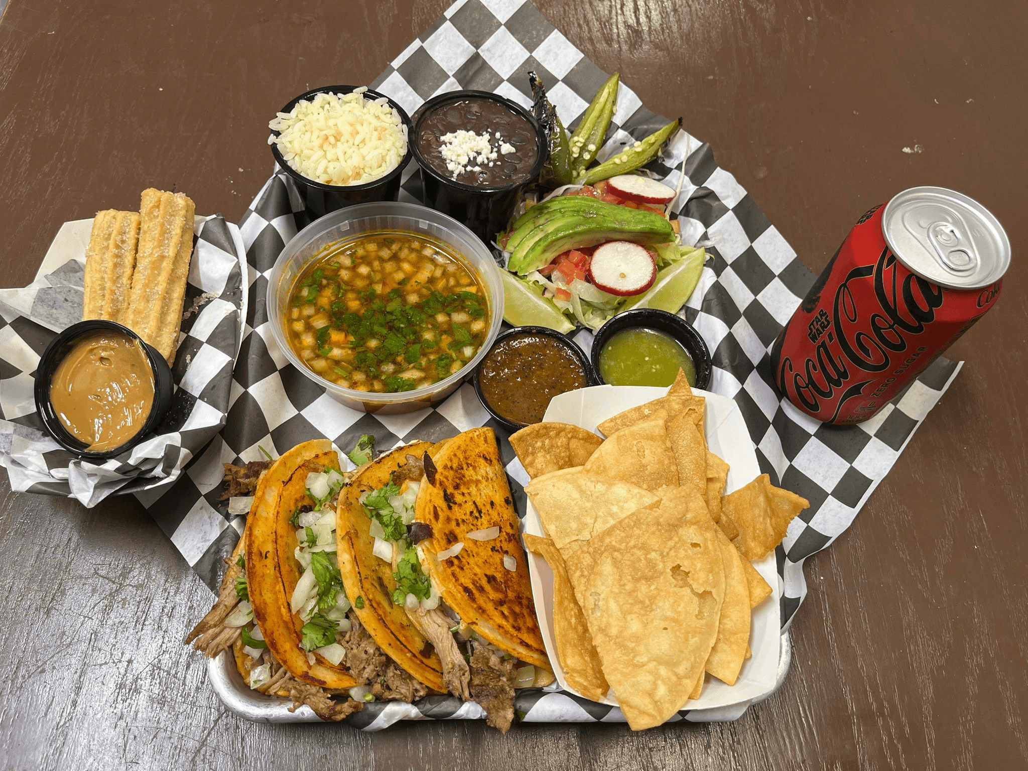 Three slow-roasted beef tacos with cheese on soft corn tortillas. Includes a bowl of consomé for soaking up additional flavor, rice, and/or beans. Served with your choice of Canned Soda plus two delicious churros!